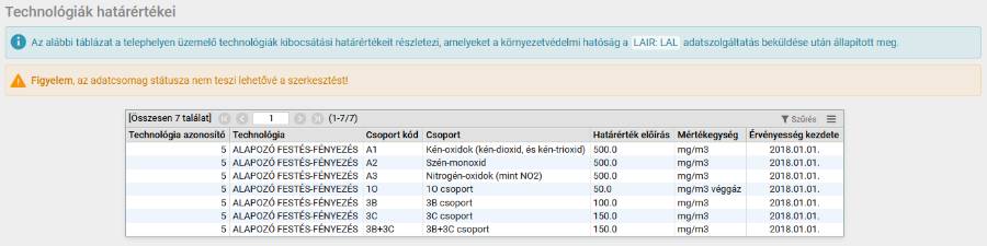 Külön lapon jelenik meg a technológiák határértékei, amelyeket be kell tartani a technológiák üzemeltetése és a kibocsátások során. Ezek az adatok a LAL adatlapon rögzített adatokból származnak.