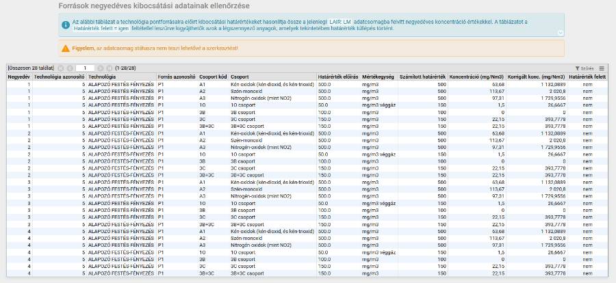 Lehetőség van a források havi és negyedéves adatainak vizsgálatára is. A betartandó határértékek a LAL adatlapon rögzített adatokból származnak, míg a kibocsátott koncentráció értékek az LM adatcsomag más lapjain megadott értékek (pl.: mérési koncentrációk) felhasználásával kerül kiszámításra. Az utolsó oszlopban kerül értékelésre, hogy a tárgyévben volt-e határérték feletti kibocsátás. Ha ebben az oszlopban igen jelzés szerepel, akkor javasolt átnézni az LM bevallásban rögzített adatokat és szükség szerint el kell végezni az adatok módosítását.